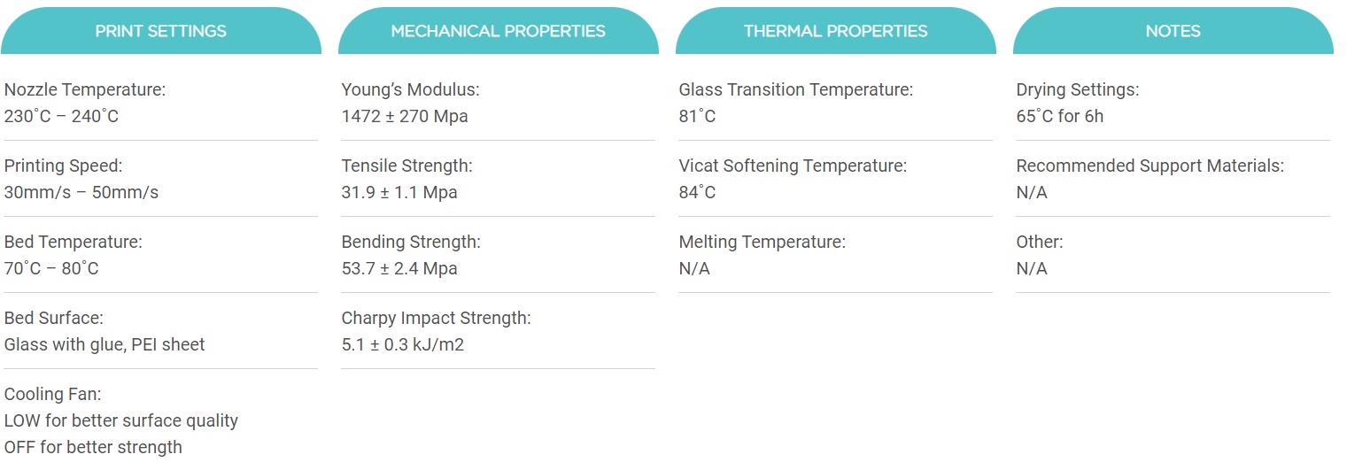 בטבלה מטה, יש פירוט של הנתונים המכניים והטרמיים של הדפסת החומר בדיזה סטנדרטית 0.4 מ"מ